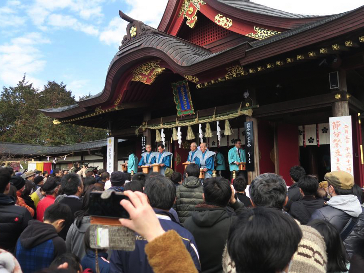 その年の厄年の男女、還暦の方々を対象とした節分厄除大祭を斎行します。その祈祷を受けた方々が「福男」「福女」となり、節分豆まきを実施します。境内に集まった参拝者の方々に対し「鬼は外!福は内!」の掛け声と共に福豆をまき、厄落としをします。豆まき終了後は、福男・福女の方々の奉仕のもとで、豚汁・甘酒・ぜんざいなどが参拝の皆様に振る舞われます。
