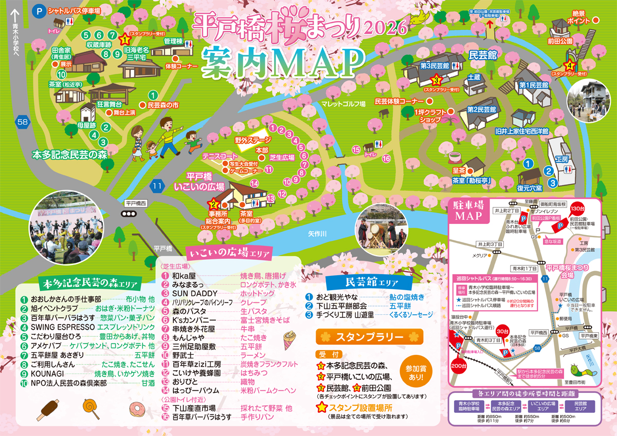 なお、お車でお越しの際は、青木小学校臨時駐車場(巡回シャトルバス運行)、前田公園・民芸館駐車場等をご利用ください。