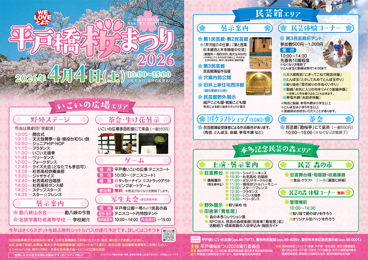 平戸橋いこいの広場・民芸館・民芸の森・平戸橋公園一帯を会場に、野外演奏、食品屋台、クラフト販売、民芸体験などをお楽しみいただけます。なお「平戸橋桜まつり」は、平成7年度から開催しており、今年で29回目を迎えます。